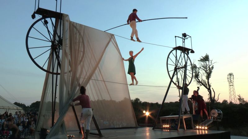 Dalle 21.30 avrà inizio l’attesissimo spettacolo-evento della compagnia francese Cirque Rouages. Su una struttura scenica (concepita e realizzata dalla compagnia stessa) che ricorda un grande proiettore Super-8 con due gigantesche ruote capaci di tenere in tensione un filo/pellicola su cui viaggiano a diversi metri da terra equilibristi e funamboli, lo spettacolo dispiega un flusso di sentimenti. I corpi di quattro artisti si muovono su di un filo che sembra infinito ed oscilla senza tregua; i funamboli sospesi scorrono da un lato all’altro come onde di un passato che ritorna e riparte senza fermarsi mai. Un inno alla vita portato in scena da un’eccellenza della scena francese che propone una poetica del corpo e dell’immagine accompagnata da musicisti che suonano, cantano e raccontano una favola di grandi altezze.