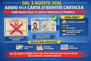Dal 3 agosto 2026 la storica carta d’identità cartacea non potrà più essere utilizzata come documento di riconoscimento, né per viaggiare all’estero, indipendentemente dalla data di scadenza riportata sul retro. La novità riguarda tutti i cittadini ancora in possesso del vecchio formato, che dovranno necessariamente sostituirlo con la Carta d’identità elettronica (Cie).