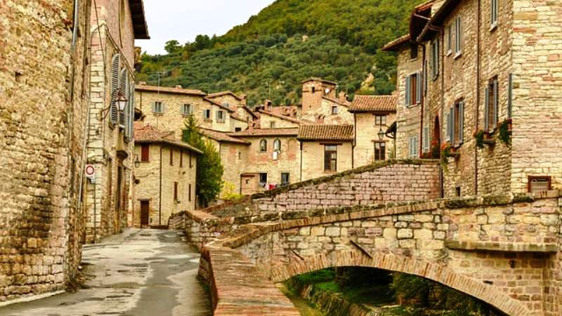 Nella parte bassa dell’abitato si sviluppa piazza Quaranta Martiri, nel Medioevo area di mercato, che ospita nel lato meridionale la chiesa di San Francesco, eretta presso il fondaco degli Spadalonga, famiglia che accolse e vestì San Francesco dopo l’abbandono della casa paterna. Di fronte, è possibile ammirare la Loggia dei Tiratori e, sempre nei pressi, la chiesa di San Giovanni, probabilmente uno degli edifici religiosi più antichi della città. Fuori dalle mura, da vedere il Mausoleo romano, la chiesa di San Secondo, la chiesa della Madonna del Prato e la chiesa della Vittorina. Di grande interesse naturalistico, oltre all’area del Parco del Monte Cucco, la suggestiva Gola del Bottaccione.